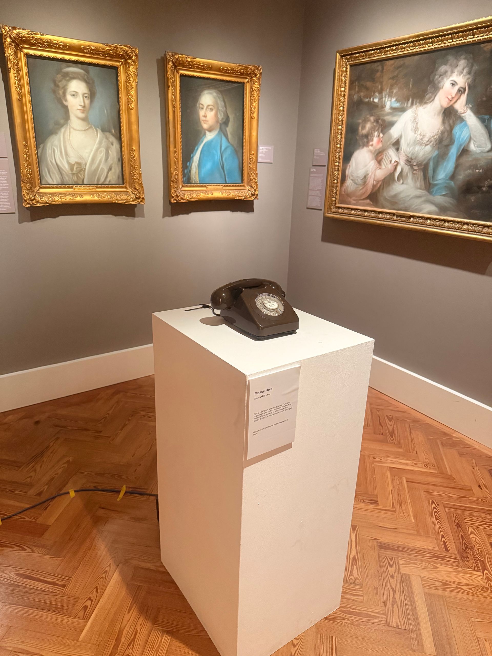 A vintage GPO 746 telephone, retrofitted for the gallery. The bell rings to draw you in; lift the handset and you hear a shuffled selection of audio pieces made by fellow Emerge members. A Raspberry Pi hidden inside handles everything — hook detection, playback, and the ringing bell.